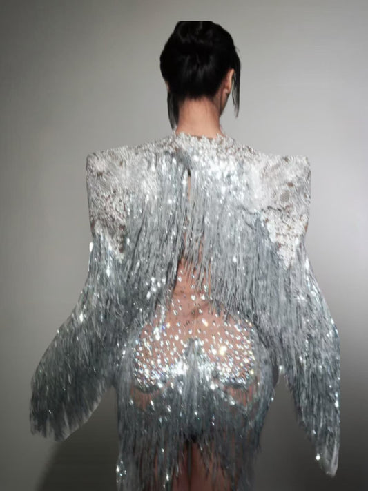 Cyvra Fringe Mesh Mini Dress With Coat In Silver