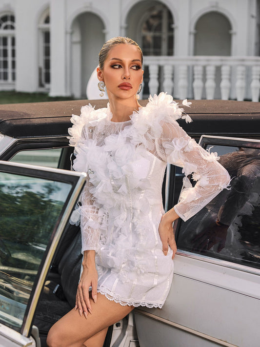 Nexara Long Sleeve Flower Trimmed Mini Dress
