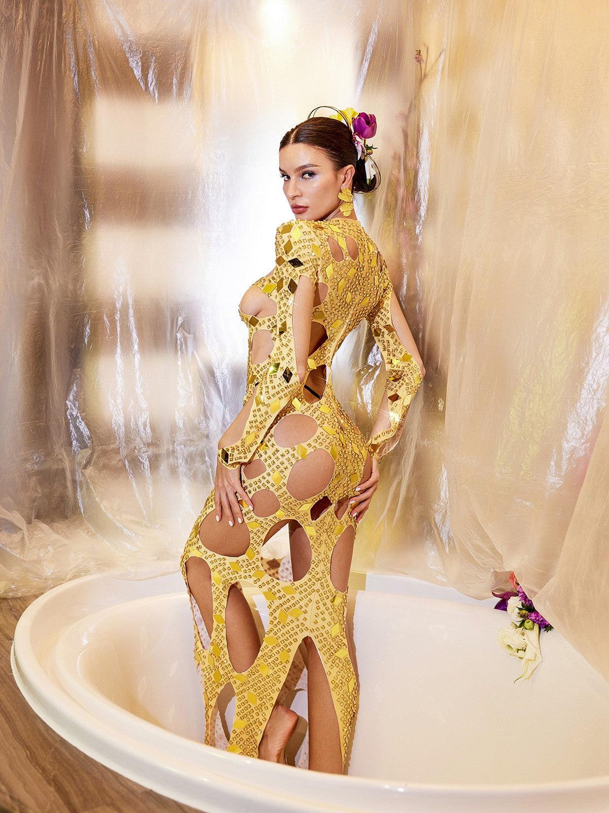 Cocona Square Hollow Embellished Dress In Gold