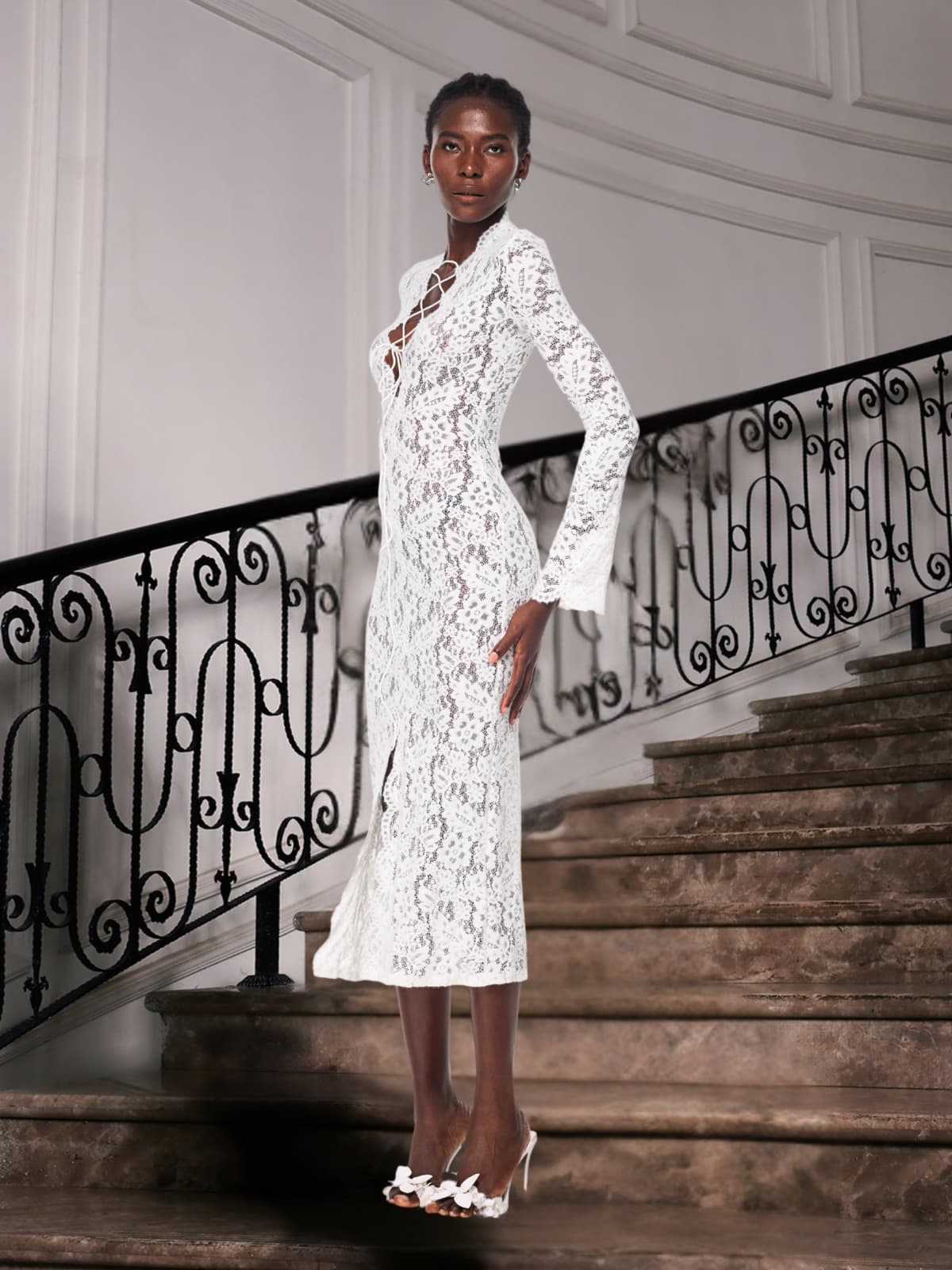 Elevate your style with the Gryndis Lace Up Split Lace Midi Dress. Featuring delicate lace detailing and a flattering lace-up design, this dress combines elegance with a hint of allure. The midi length and side split create a graceful silhouette perfect for special occasions or evening events. Embrace confidence and sophistication effortlessly in this stunning piece.