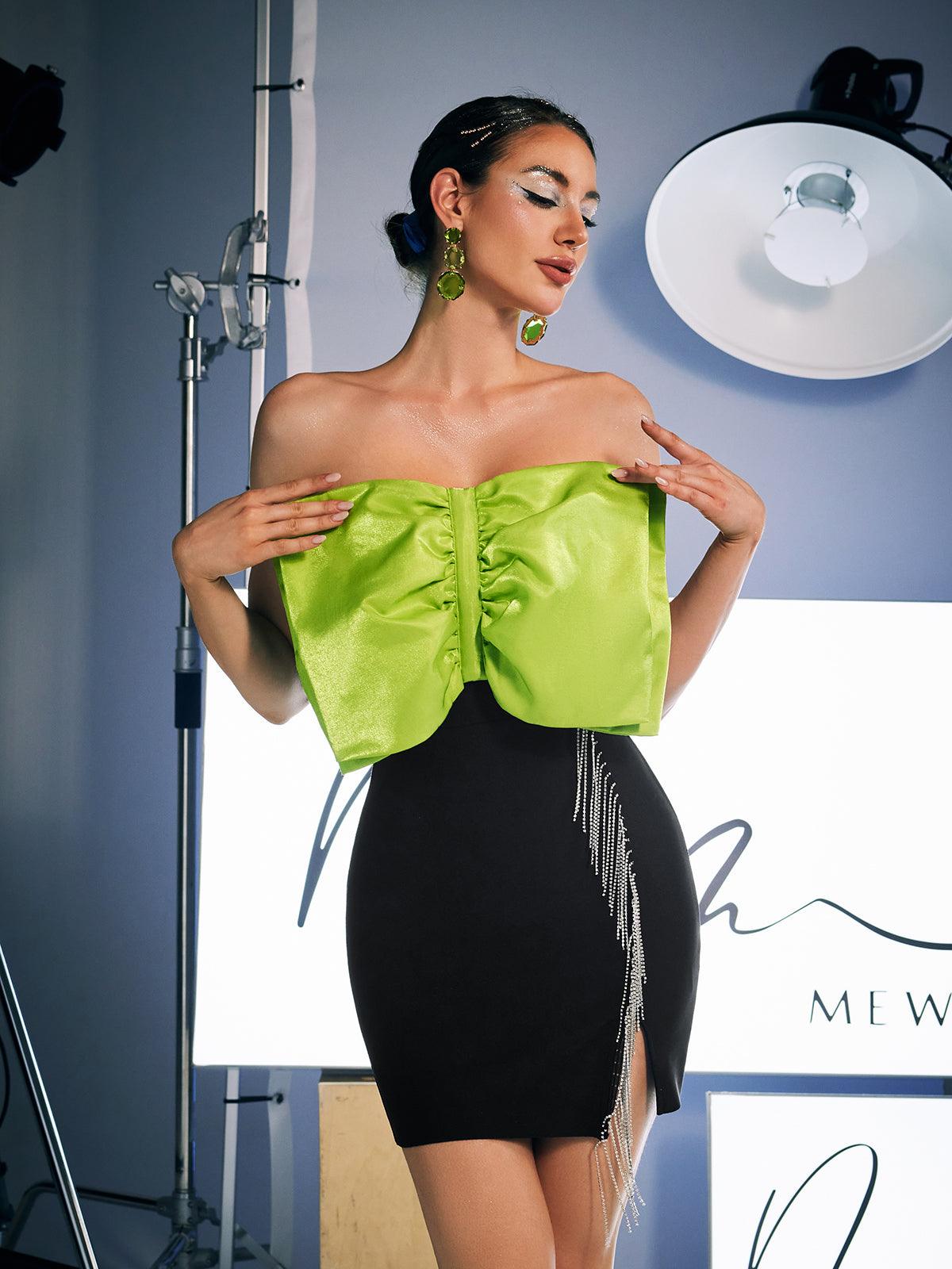 Elevate your style with the Idony Strapless Bow Crystal Fringe Mini Dress. This stunning dress features a delicate bow detail and eye-catching crystal fringe, adding an extra touch of glamour to any outfit. Perfect for a night out or special occasion, this dress will make you feel confident and chic.
