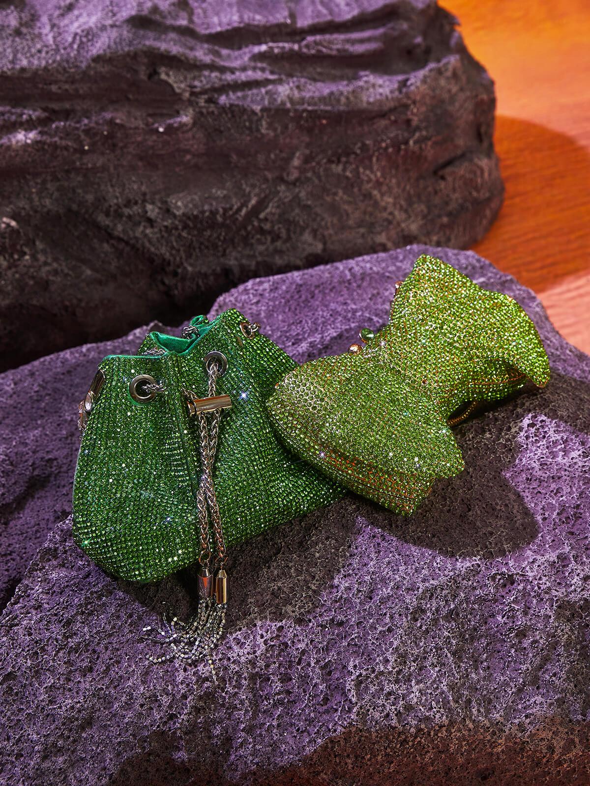 Our signature Mattea Crystal Embellished Bucket Bag In Green is crafted from hot pink crystal. A statement accessory to love forever, it is finished with a sparkling crystal top handle and a sleek drawstring chain that cinches the supple shape. Take yours with you everywhere.