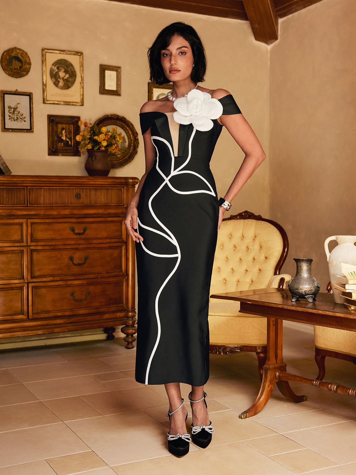 Shegar Off Sleeve Flower Bandage Mini Dress